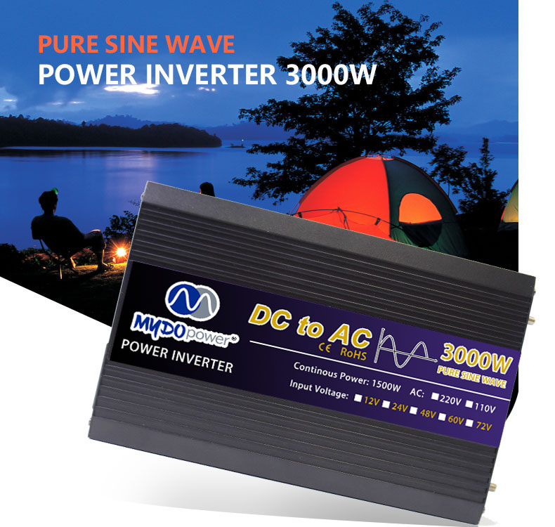 Brand:mydo/oem Model:MDH-3000W Input voltage:12v 24v48v60v Output voltage:110v/220v Output frequency:50hz/60hz Product size:23*15*7cm Gross weight:3.5kg