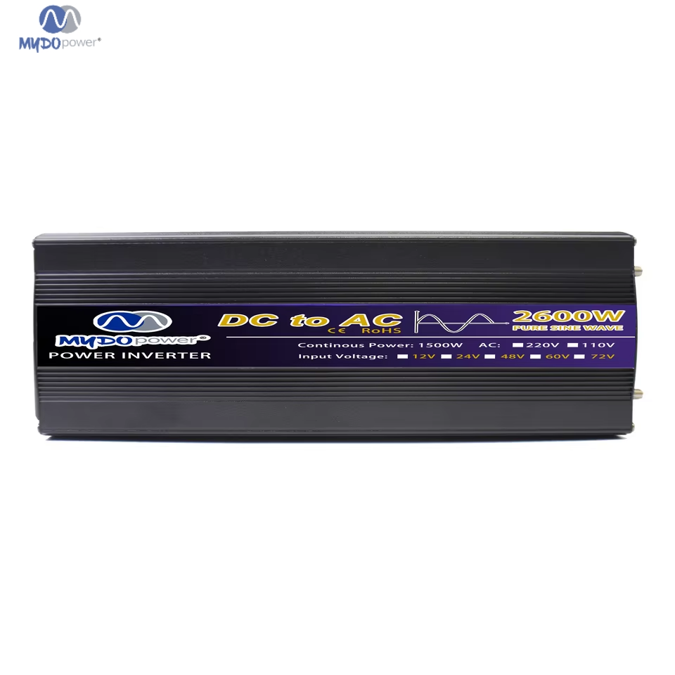 Origin: Guangdong, China Model: MD2600W Output voltage: AC 110V/220V Output type: Single Output frequency: 50Hz/60Hz Pure sine wave Peak power: 1500W