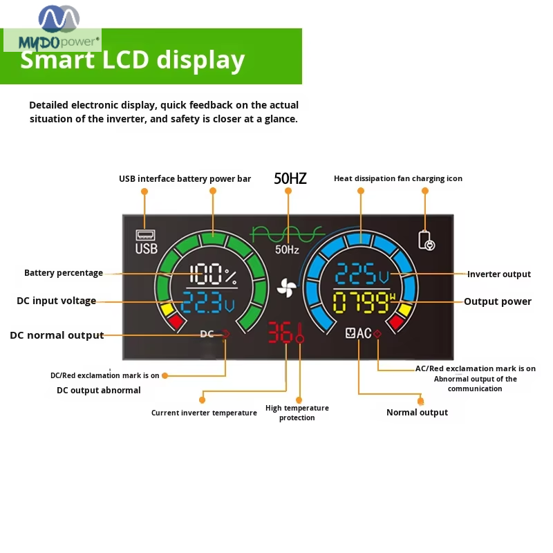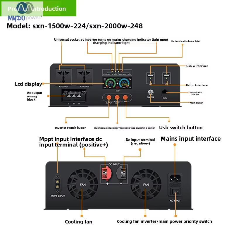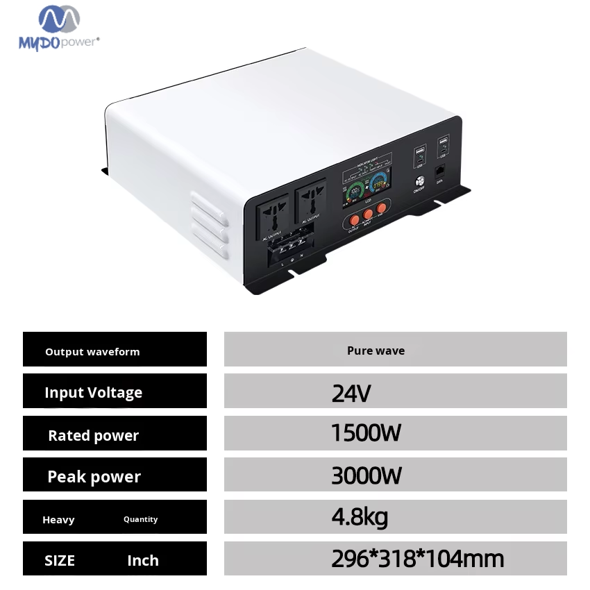 item value Place of Origin China Inverter Efficiency 93% Model Number MY-1500W-224 Brand Name MYDO power Input Voltage 24v/48v Output Voltage 220v Output Current 1500w Output Frequency 50/60hz Size 29.6*31.8*10.4cm Type DC/AC Inverters Weight 4.8kg