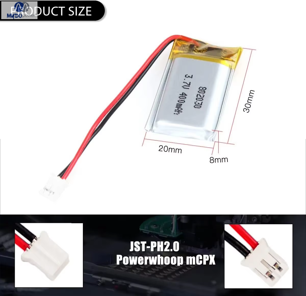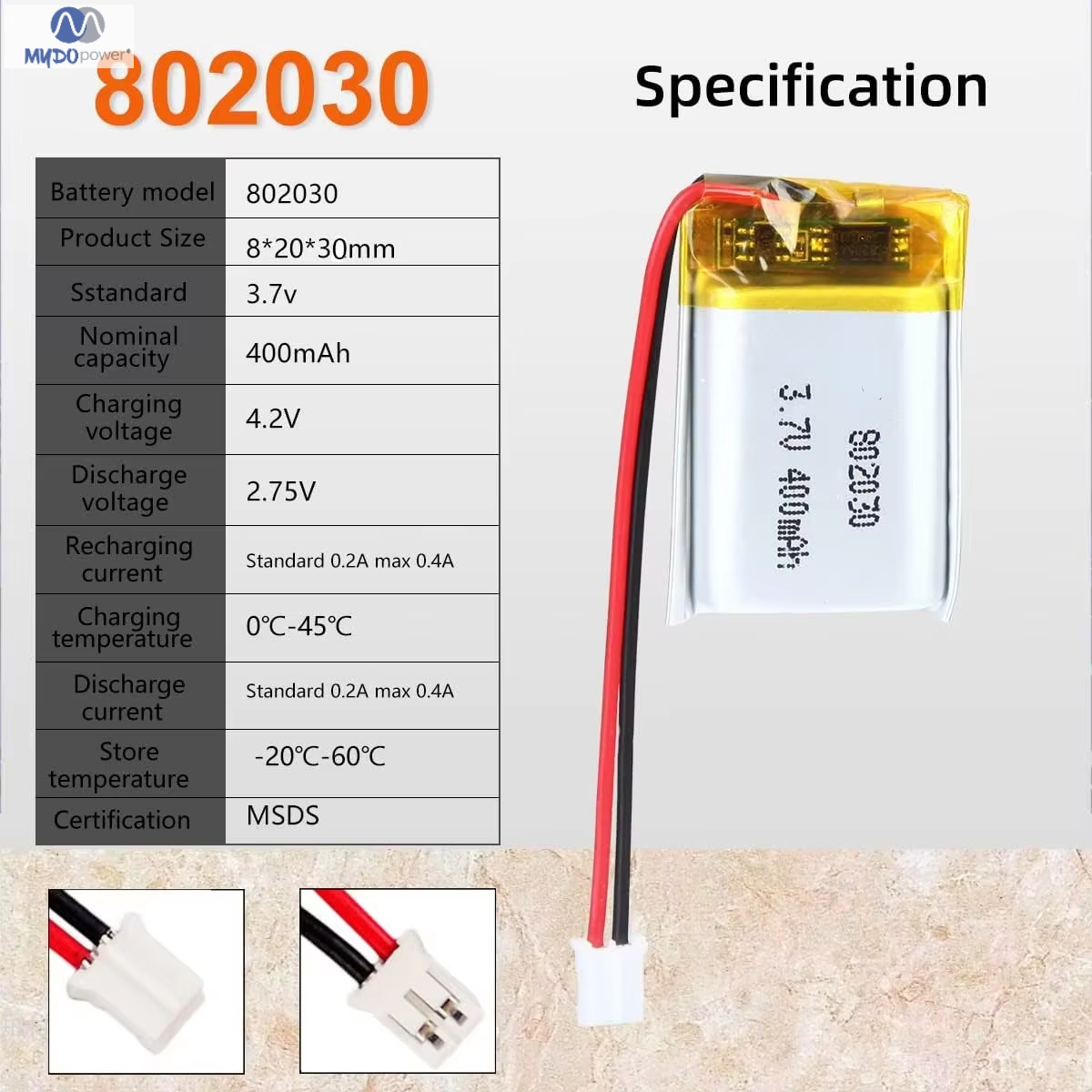 thing Lipolymer battery Battery size 802030 400mah application Consumer Electronics Cycle life 500 times Cathode Materials other model 802030 Working temperature(℃) -20 - 60 Brand Name Mydo Battery Type Solid State weight 8 g Origin China