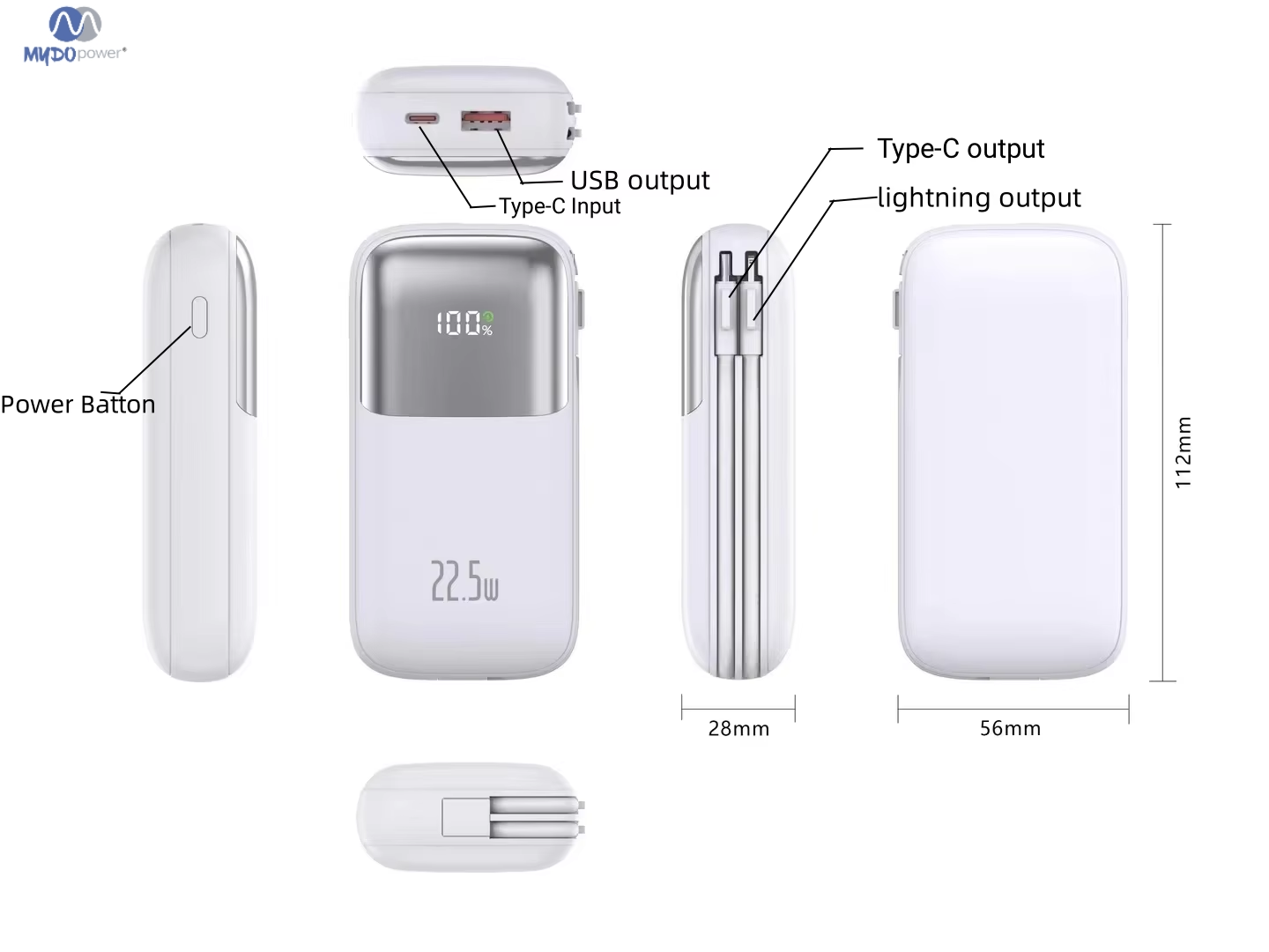 Brand: MYDOpower Model: Mi02 Output: Type-C IP-C Input: 5V - 3A / 5V - 2A / 9V - 2A / 12V - 1.5A Rated Power: 20W Capacity: 10,000mAh Weight: 200g Origin: China Delivery Time: 3-7 Days Minimum Order Quantity: 10 pcs Warranty: 12 Months Colors: Black, White, Purple