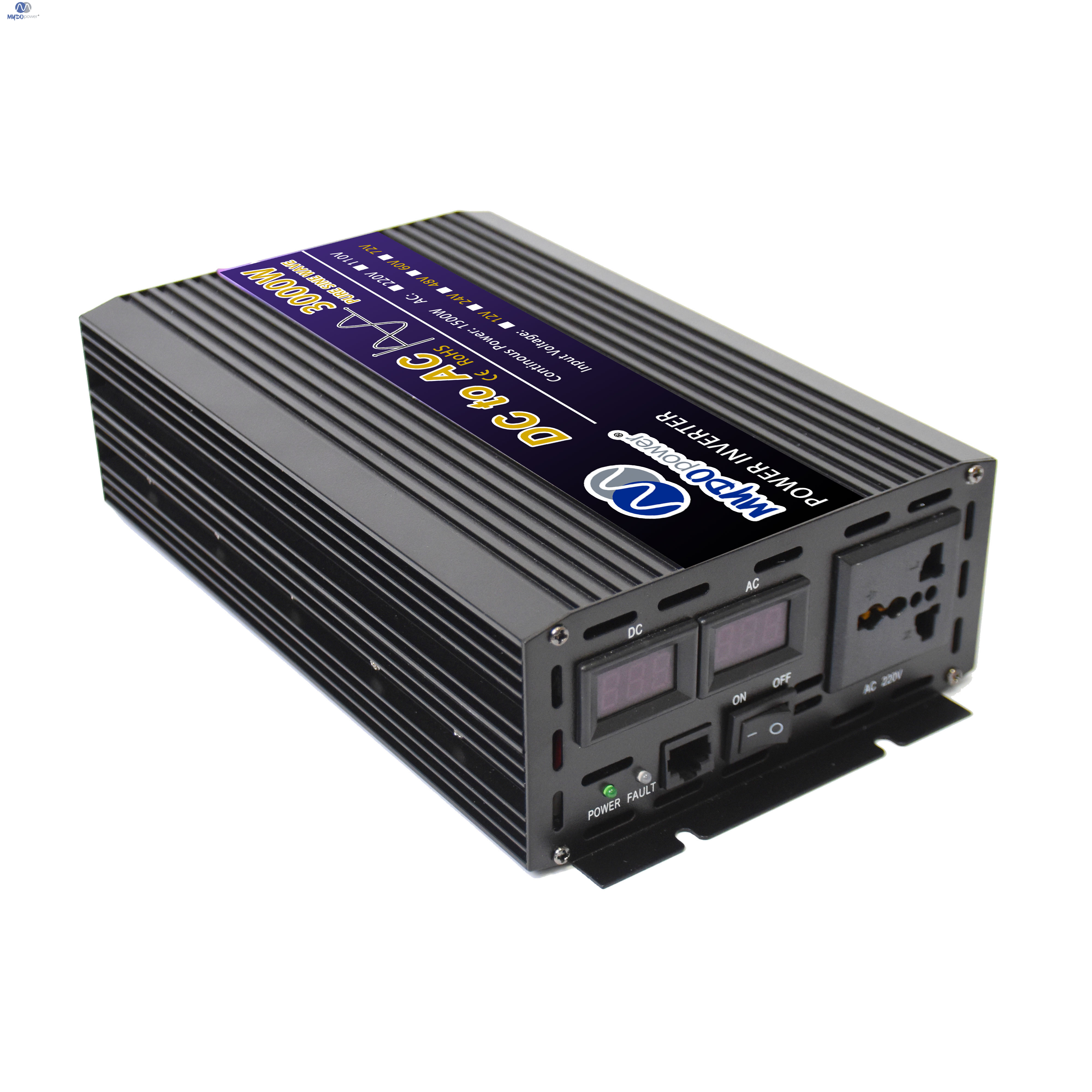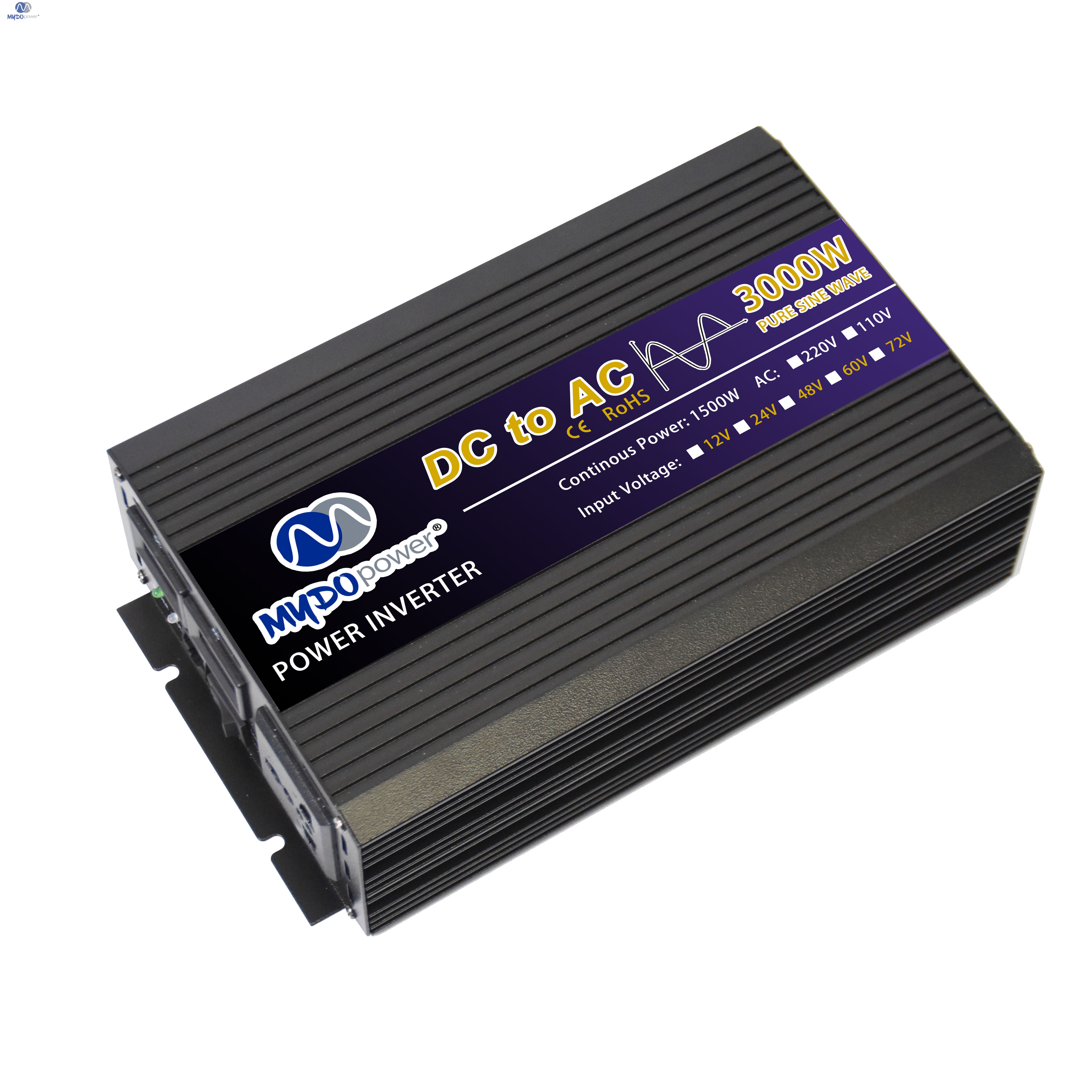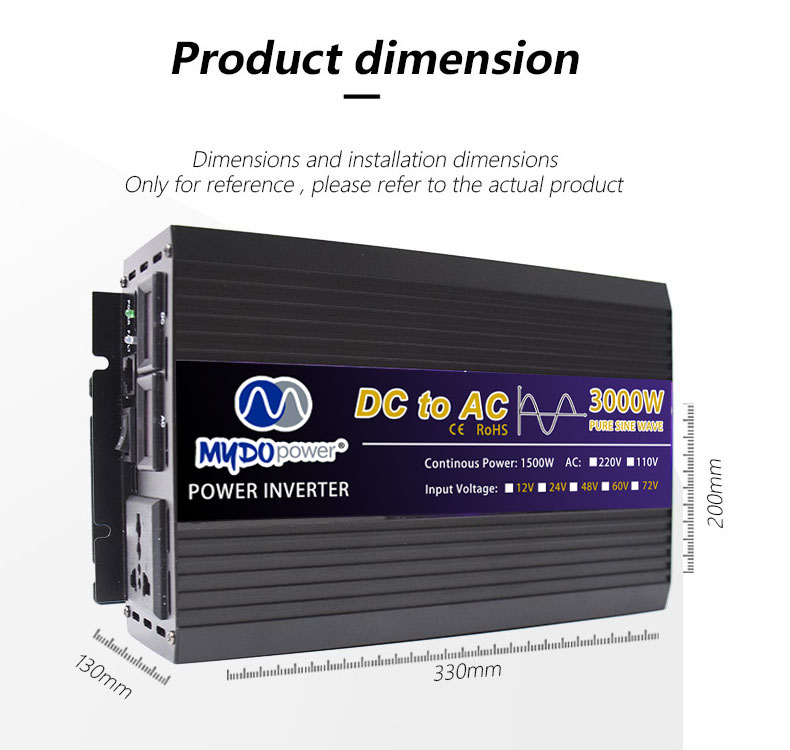 Brand:mydo/oem Model:MDH-3000W Input voltage:12v 24v48v60v Output voltage:110v/220v Output frequency:50hz/60hz Product size:23*15*7cm Gross weight:3.5kg