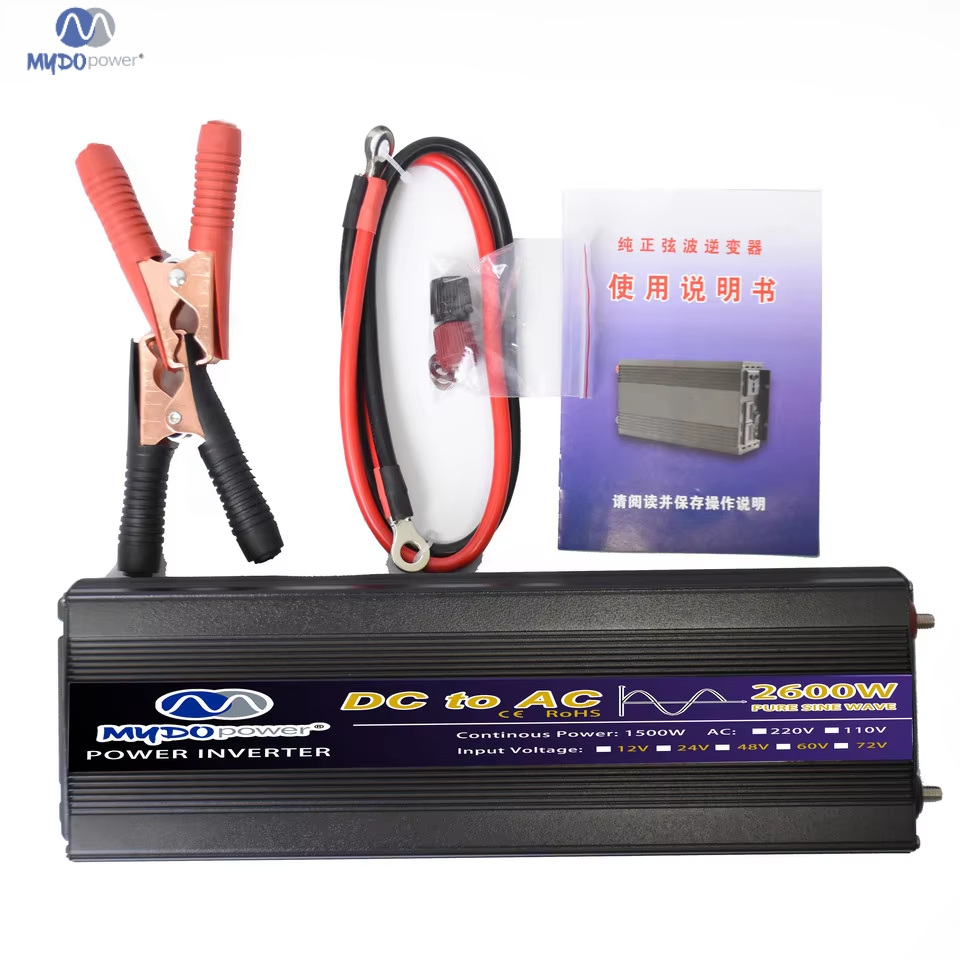Origin: Guangdong, China Model: MD2600W Output voltage: AC 110V/220V Output type: Single Output frequency: 50Hz/60Hz Pure sine wave Peak power: 1500W
