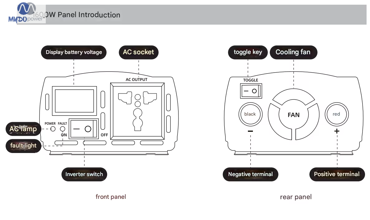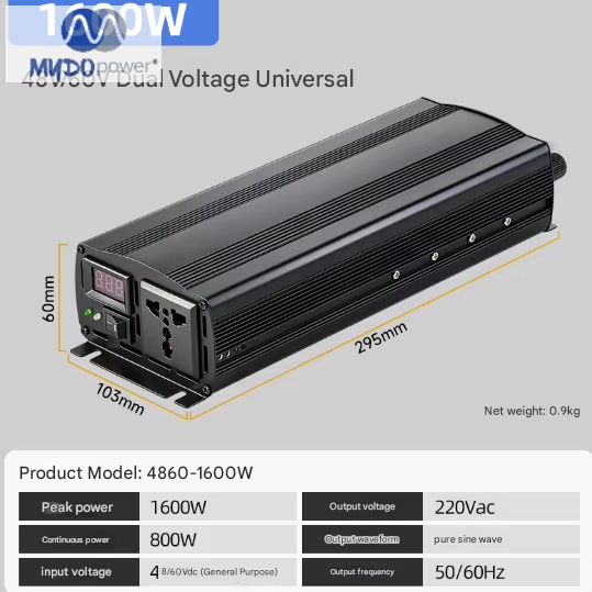 Brand: Mydo Power Model: GD-1600W Input Voltage: 48V, 60V, 72V Output Frequency: 50Hz/60Hz Type: DC/AC Product Dimensions: 26.8*15.3*7.5cm Output Voltage: 220V